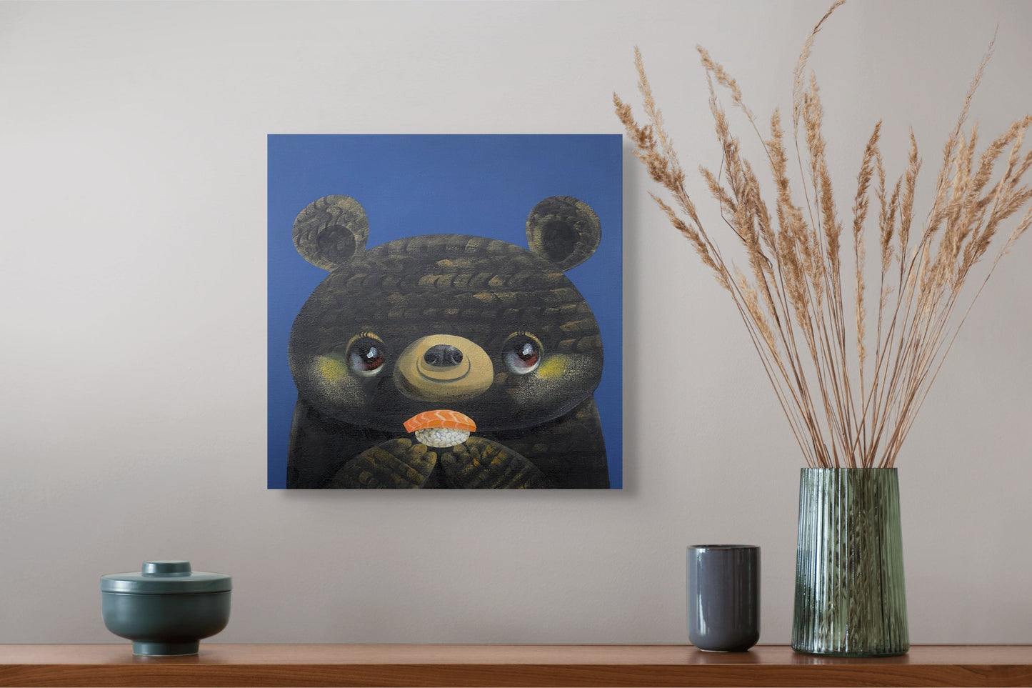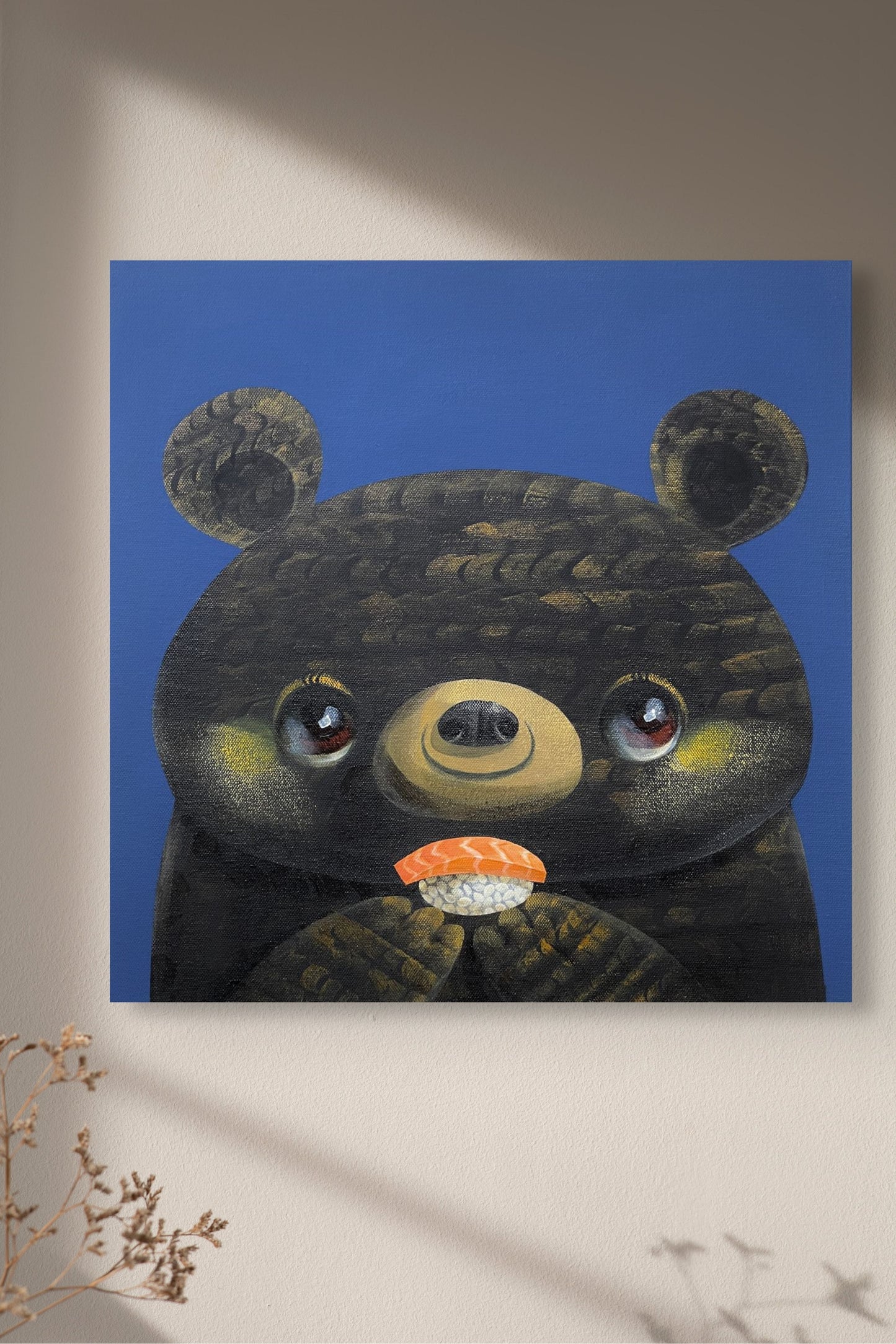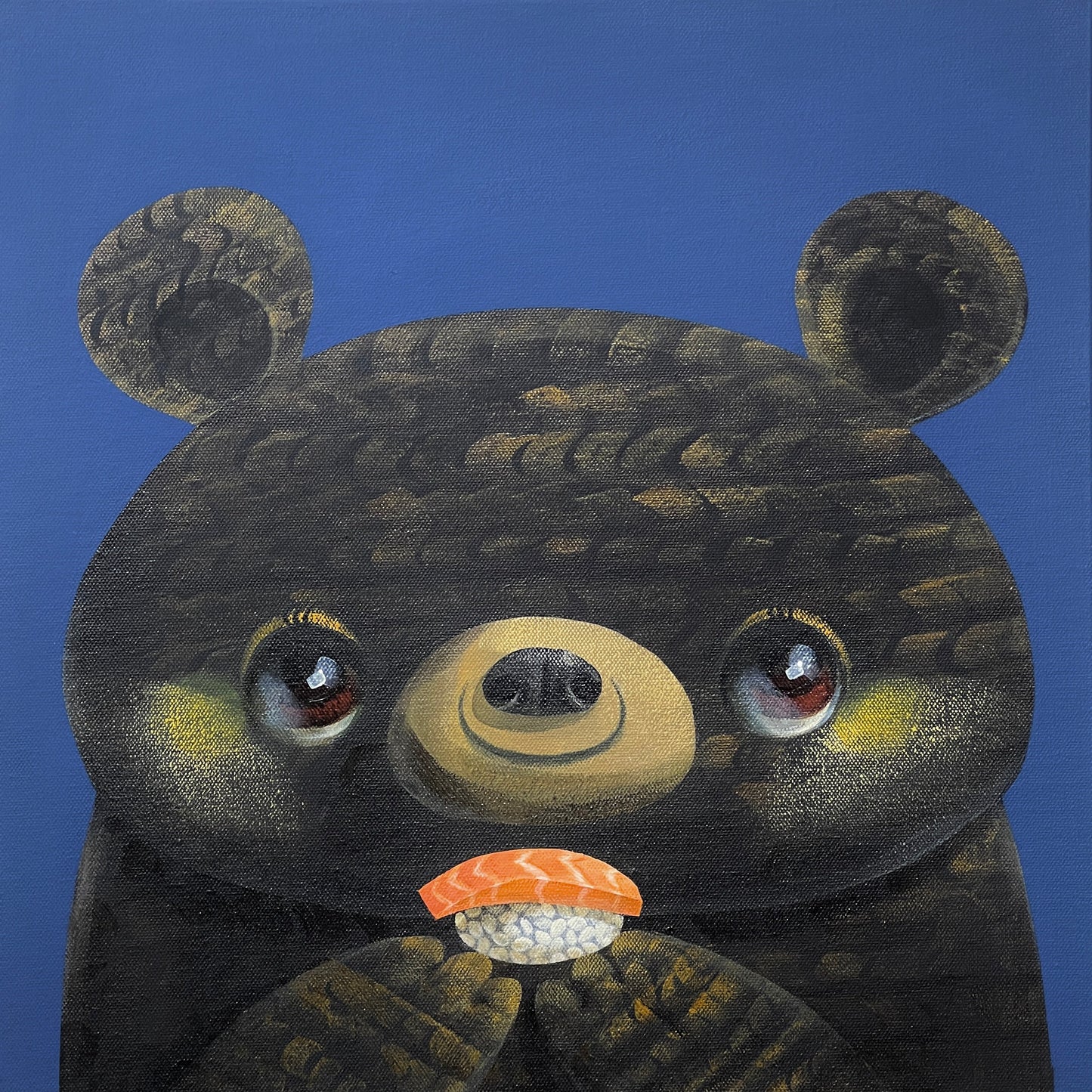 Akio Harada's humorous and endearing artwork "Salmon for the Time Being" depicts a bear clutching a slice of salmon sushi. The bear's gentle smile adds an appealing aspect, and its huge, soulful eyes and textured fur give it a realistic yet playful appearance. The sushi is the piece's main focus because of the striking contrast between the bright blue background and the bear's warm tones and the salmon's bright orange. This charming piece of art combines tenderness and comedy, exhibiting Harada's distinctive ability to capture whimsy and innocence.