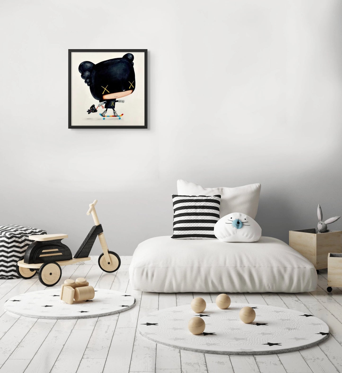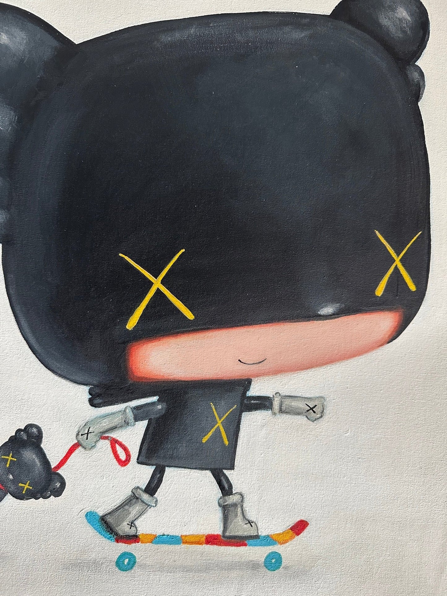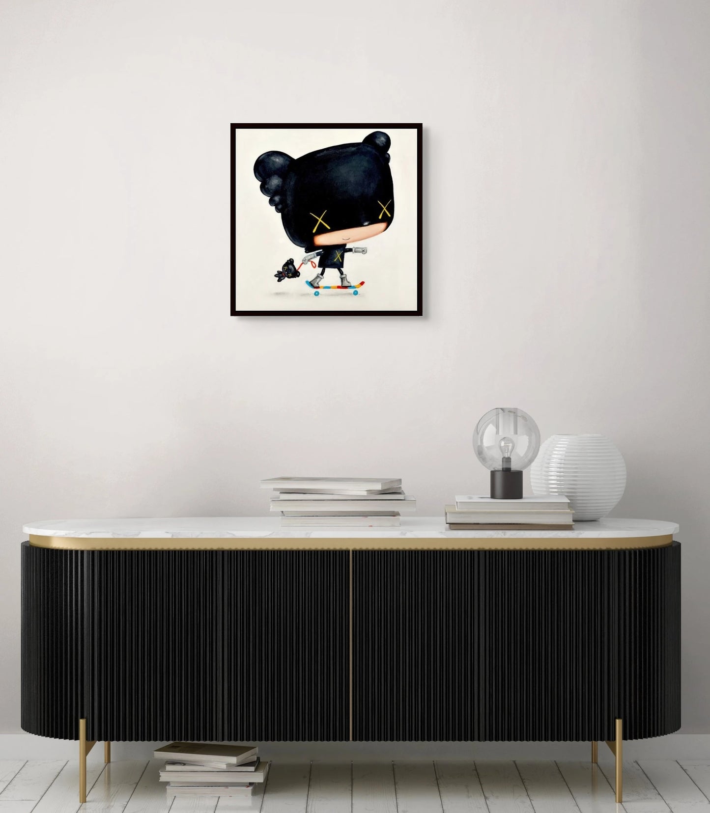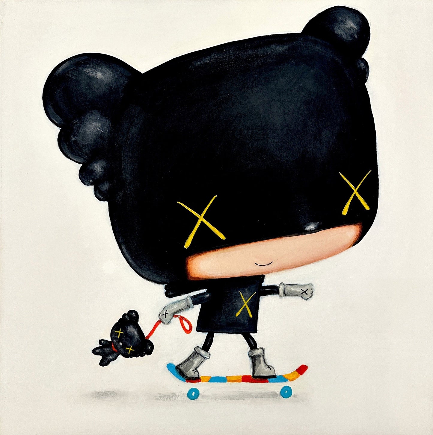 "Skate" by Nico da Rocha is a charming 20"x20" inches painting crafted with acrylic, pastels, markers, and pencils. It features a cute, cartoonish character on a colorful skateboard, holding a small plush toy. The artwork captures the joy and freedom of skateboarding, blending playful imagery with vibrant colors, making it a delightful piece full of whimsy and fun.