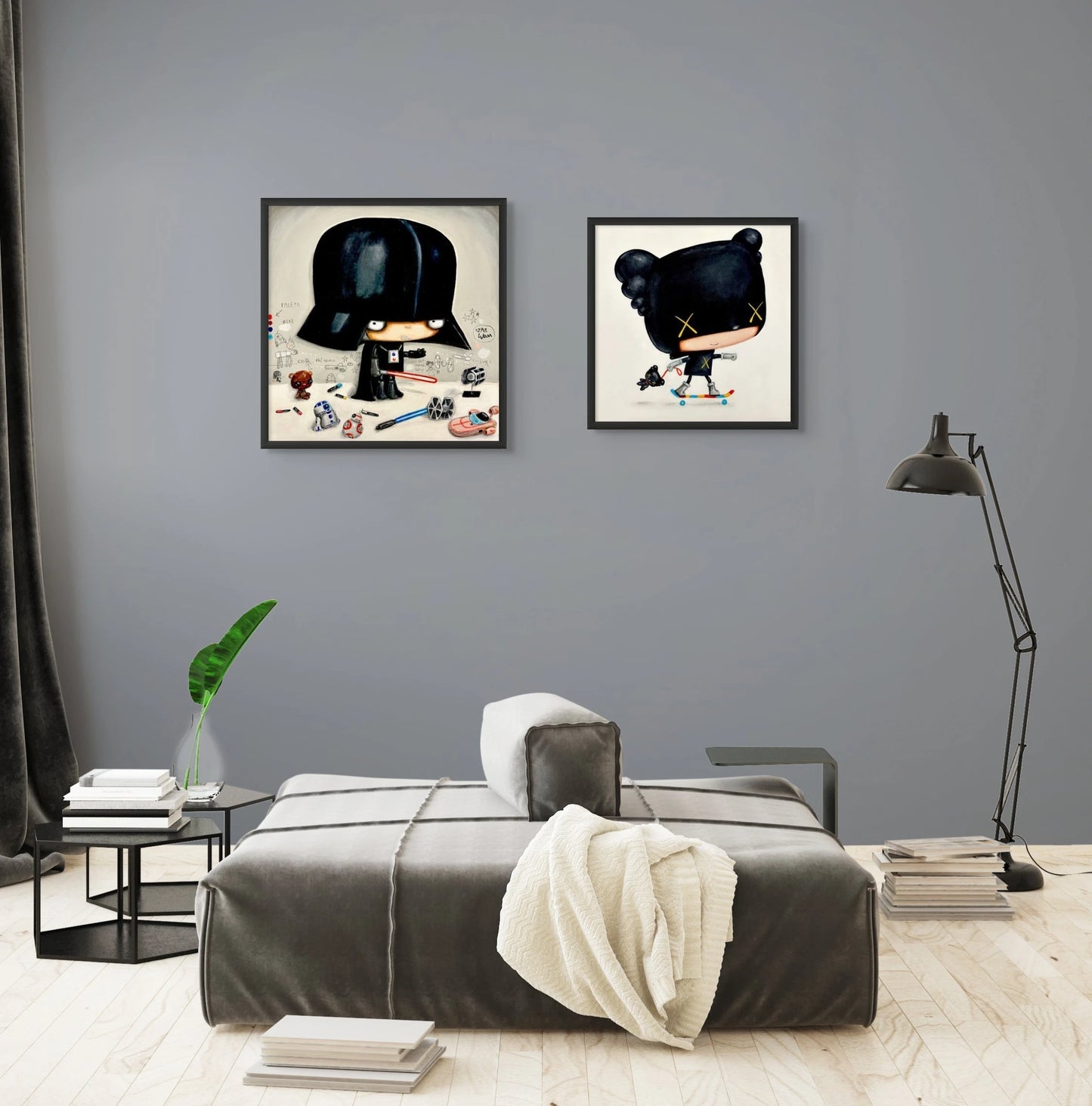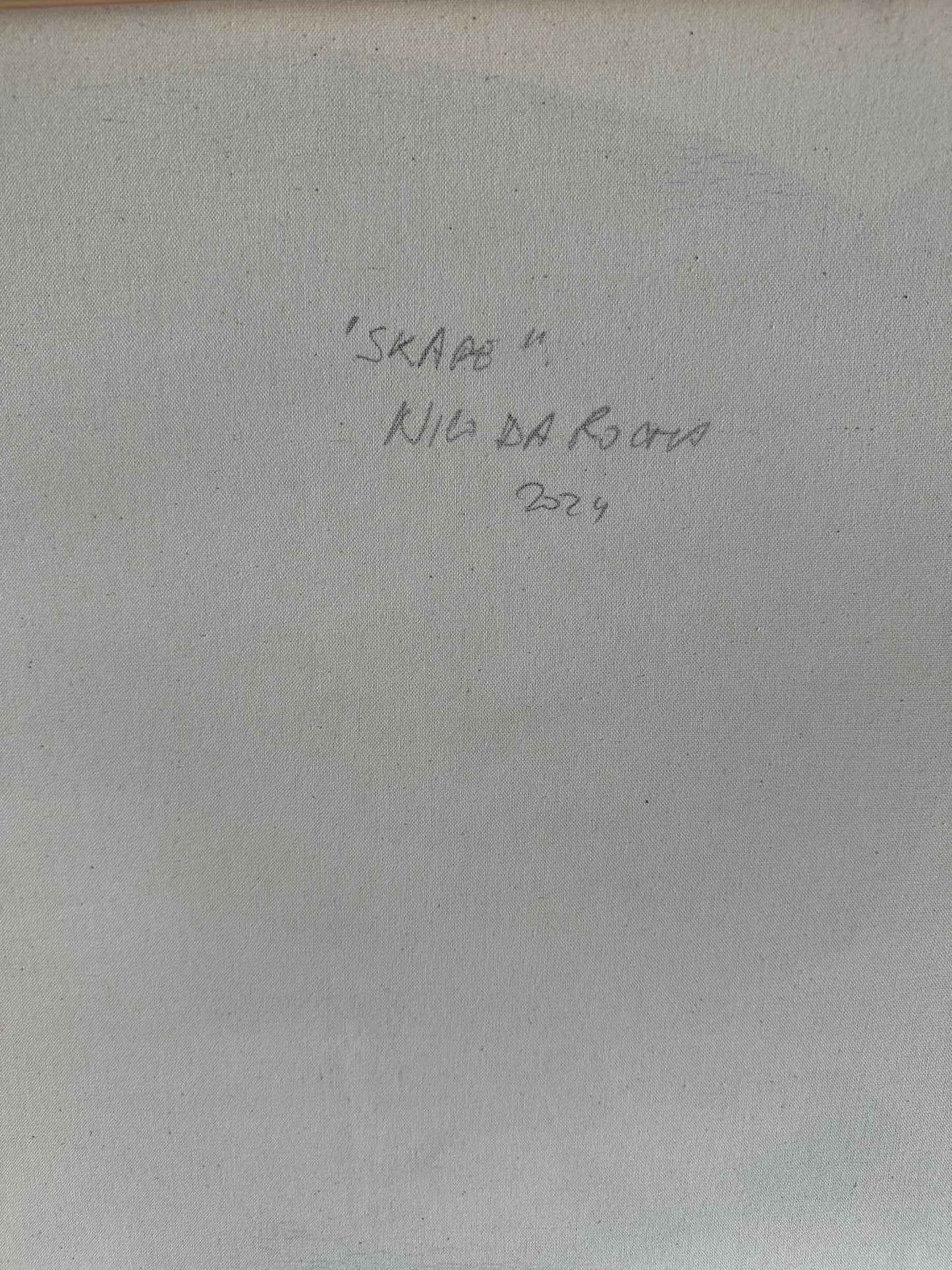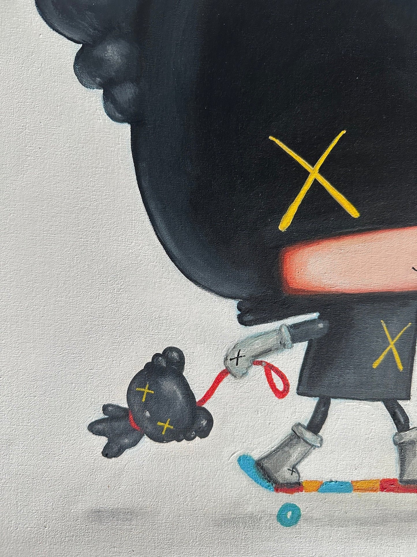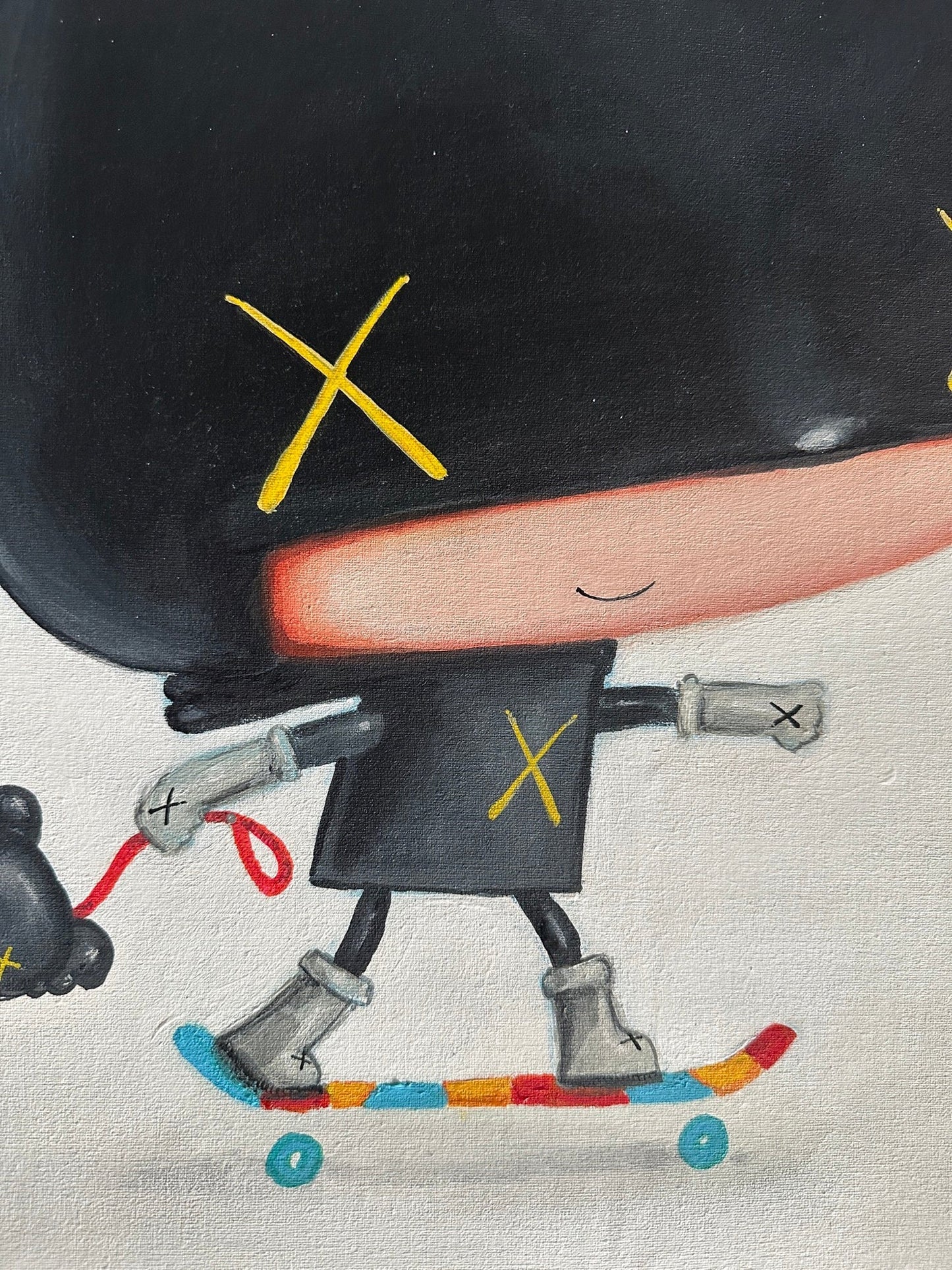 "Skate" by Nico da Rocha is a charming 20"x20" inches painting crafted with acrylic, pastels, markers, and pencils. It features a cute, cartoonish character on a colorful skateboard, holding a small plush toy. The artwork captures the joy and freedom of skateboarding, blending playful imagery with vibrant colors, making it a delightful piece full of whimsy and fun.