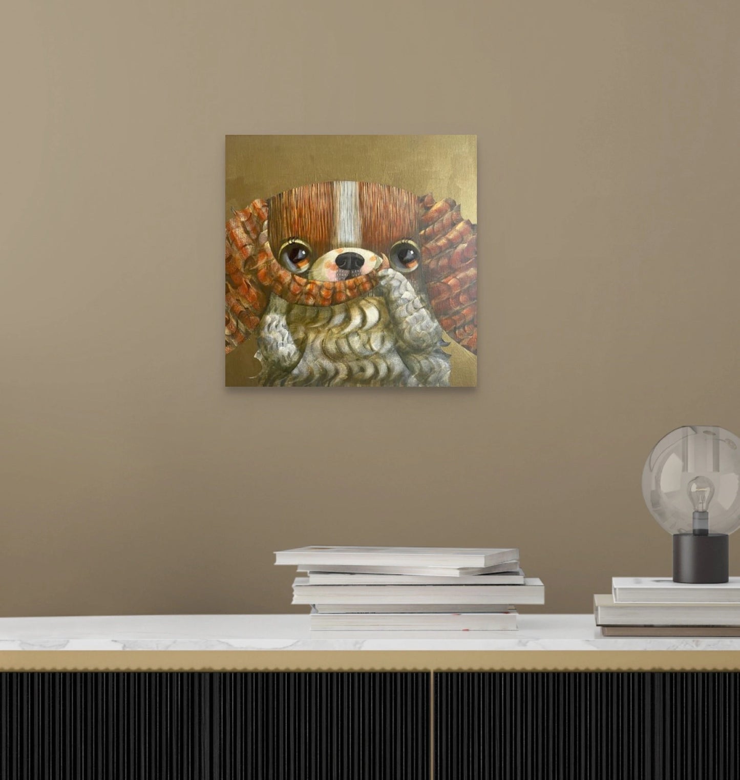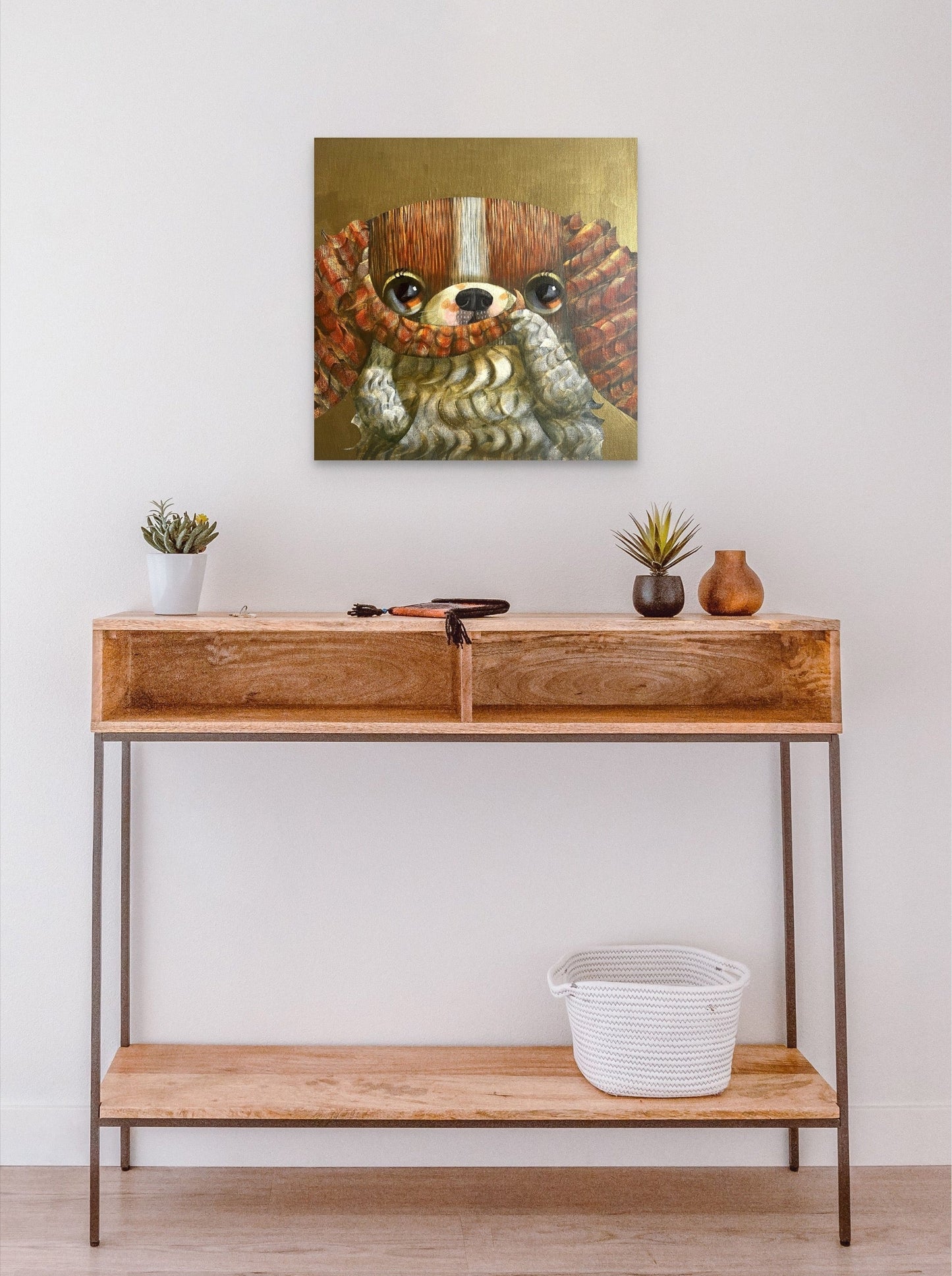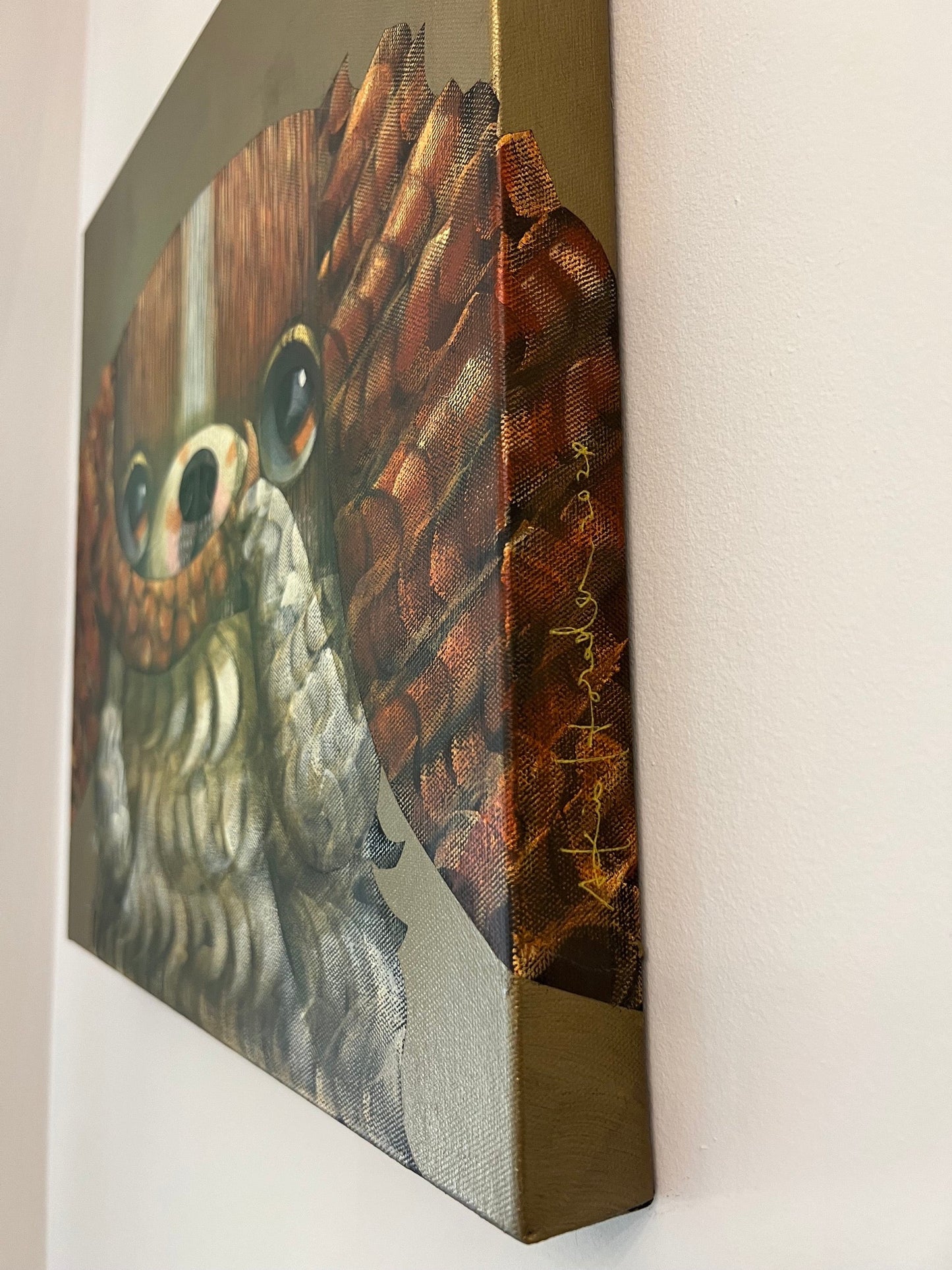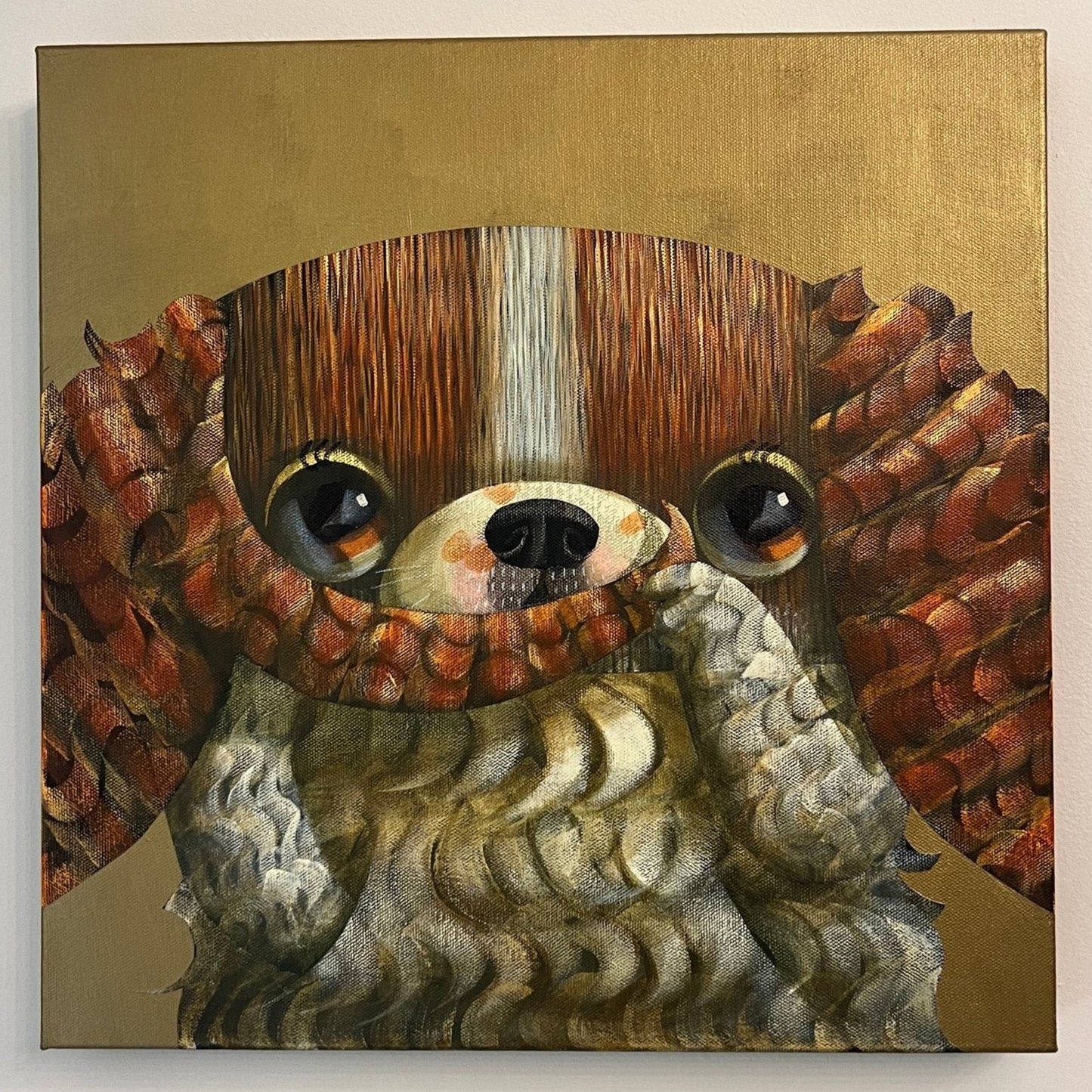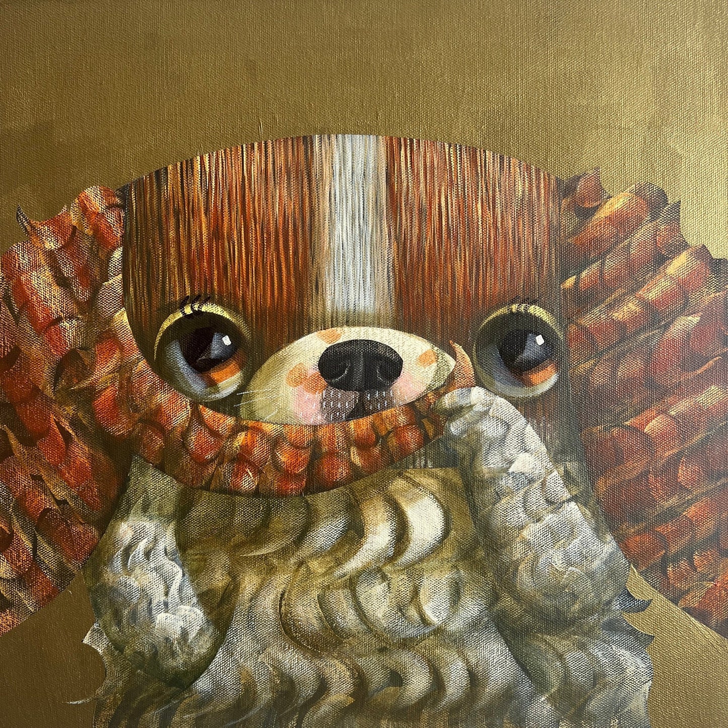 Smell of Beard' depicts a whimsical creature with an intricate, textured beard, conveying a sense of curiosity and enchantment. Harada's rich use of warm tones and detailed brushwork enhances the playful yet mysterious aura, making it a captivating addition for any art collector who values imagination and intricate detail.