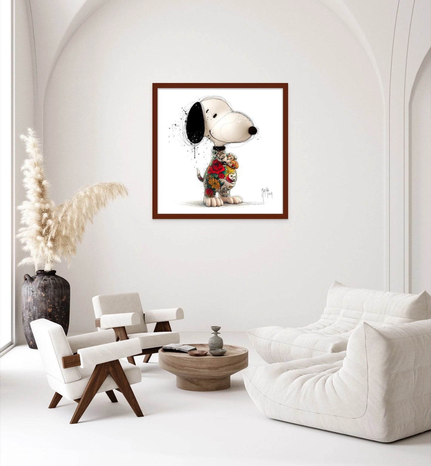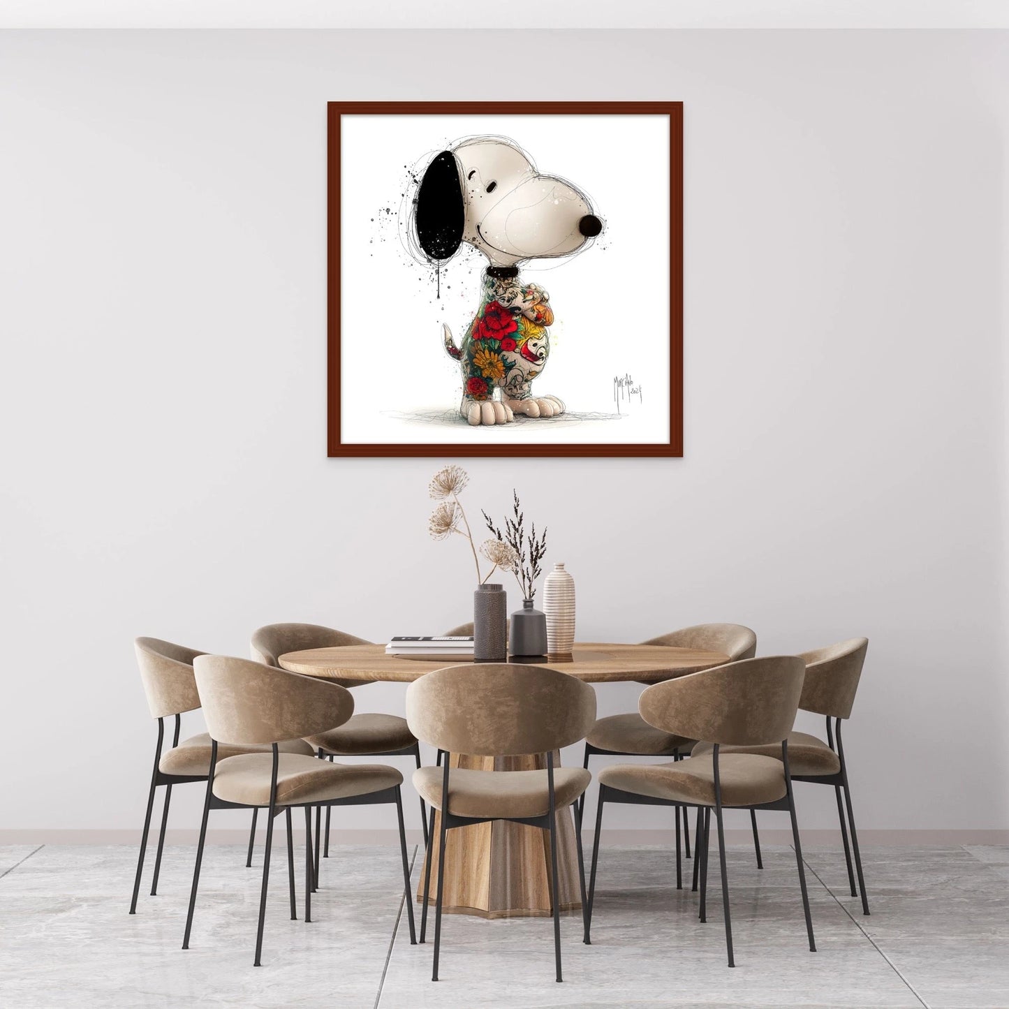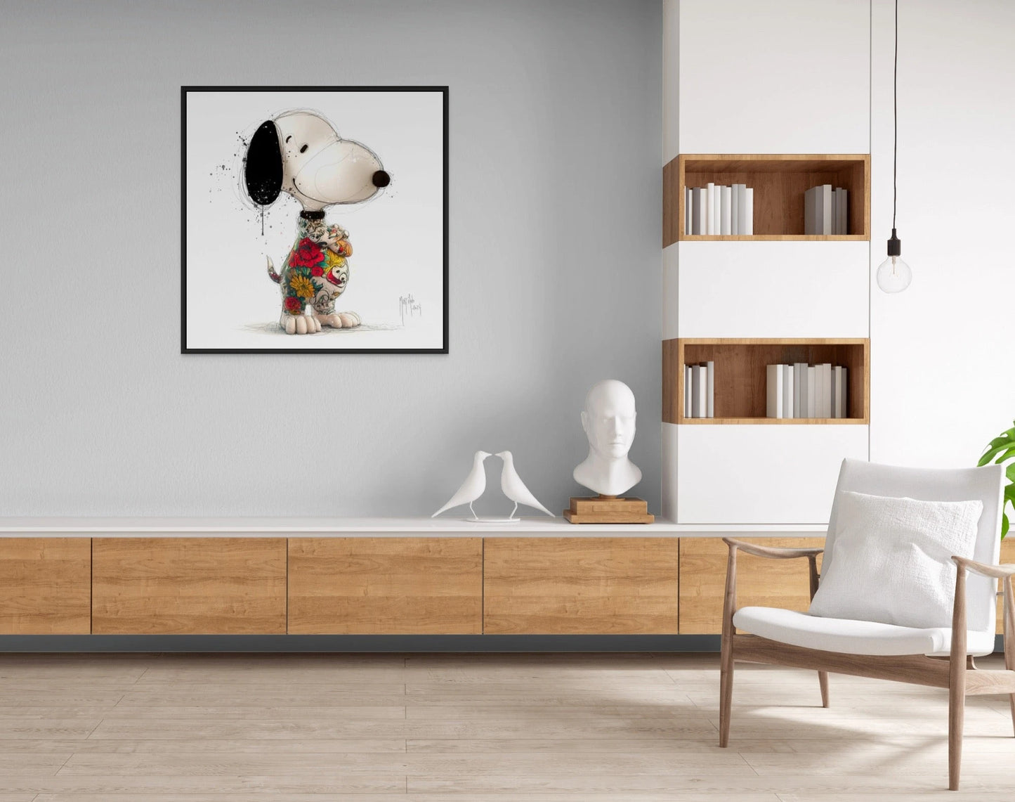 "Murciano's 'Snoopy' enlivens the classic beagle with a twist, adorning him in a vibrant tattoo-like floral pattern on a 39"x39" inch. (100x100 cm) canvas, merging whimsy with a splash of rebellion."