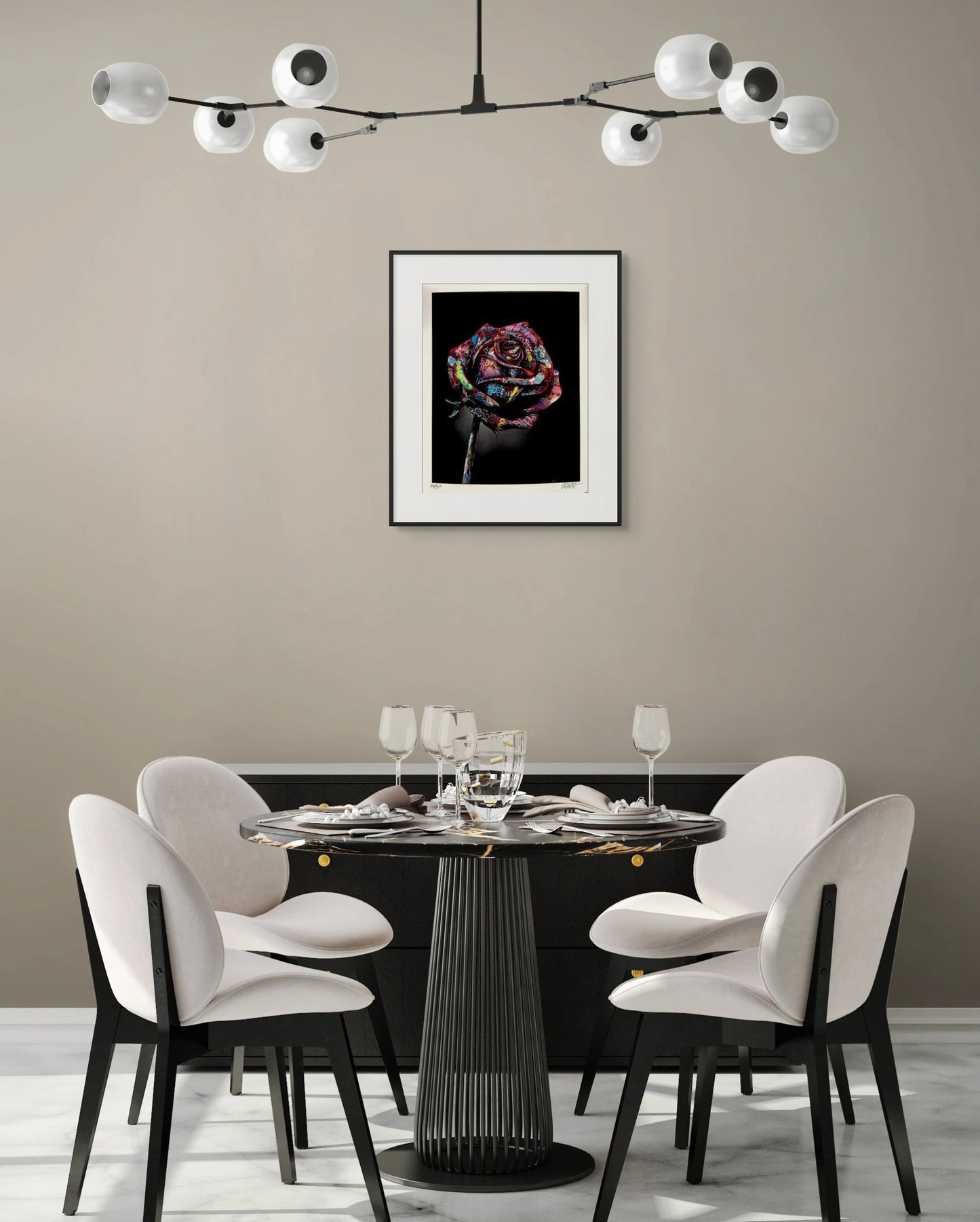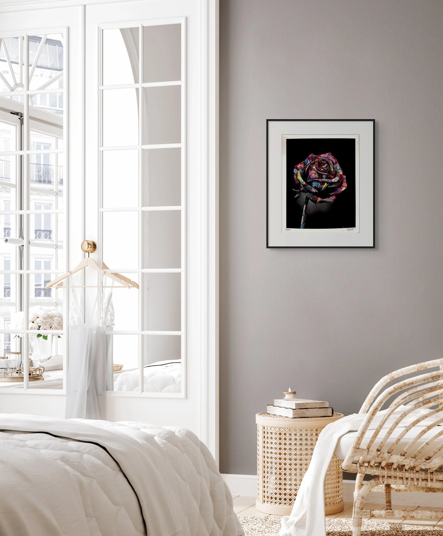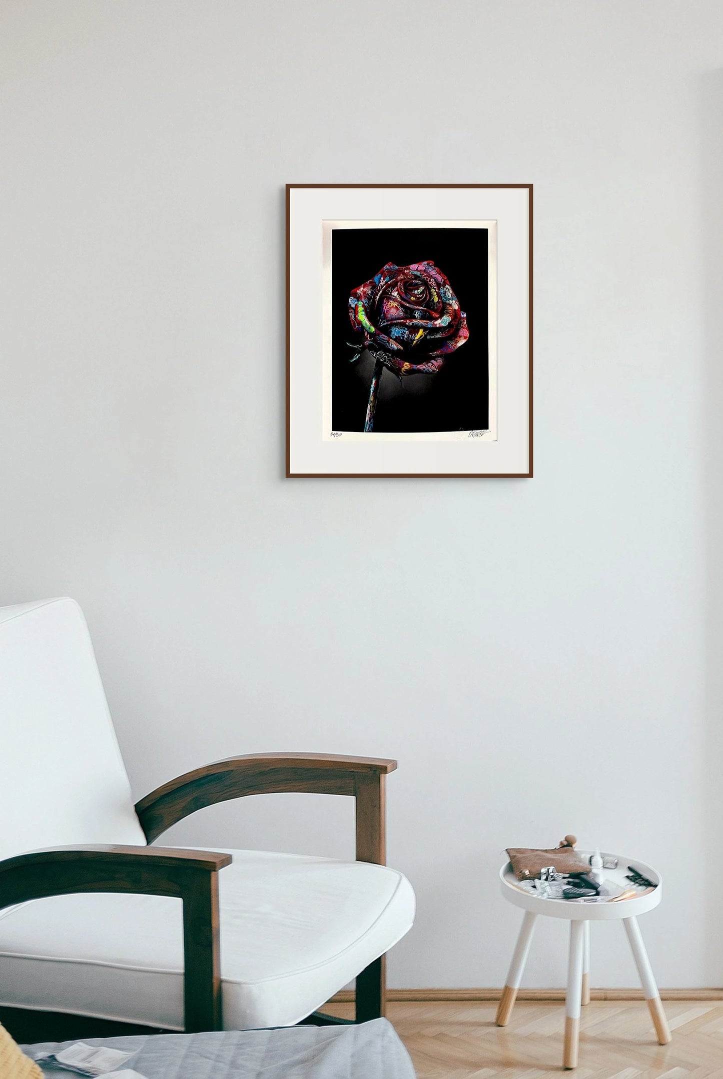The depth of the black backdrop ensures that the intense, kaleidoscopic colors of the rose command full focus, allowing every detail to be fully appreciated without distraction. The artist's signature at the bottom right, accompanied by the edition number in the bottom left corner, indicates this piece is part of a limited series, adding to its exclusivity and value.