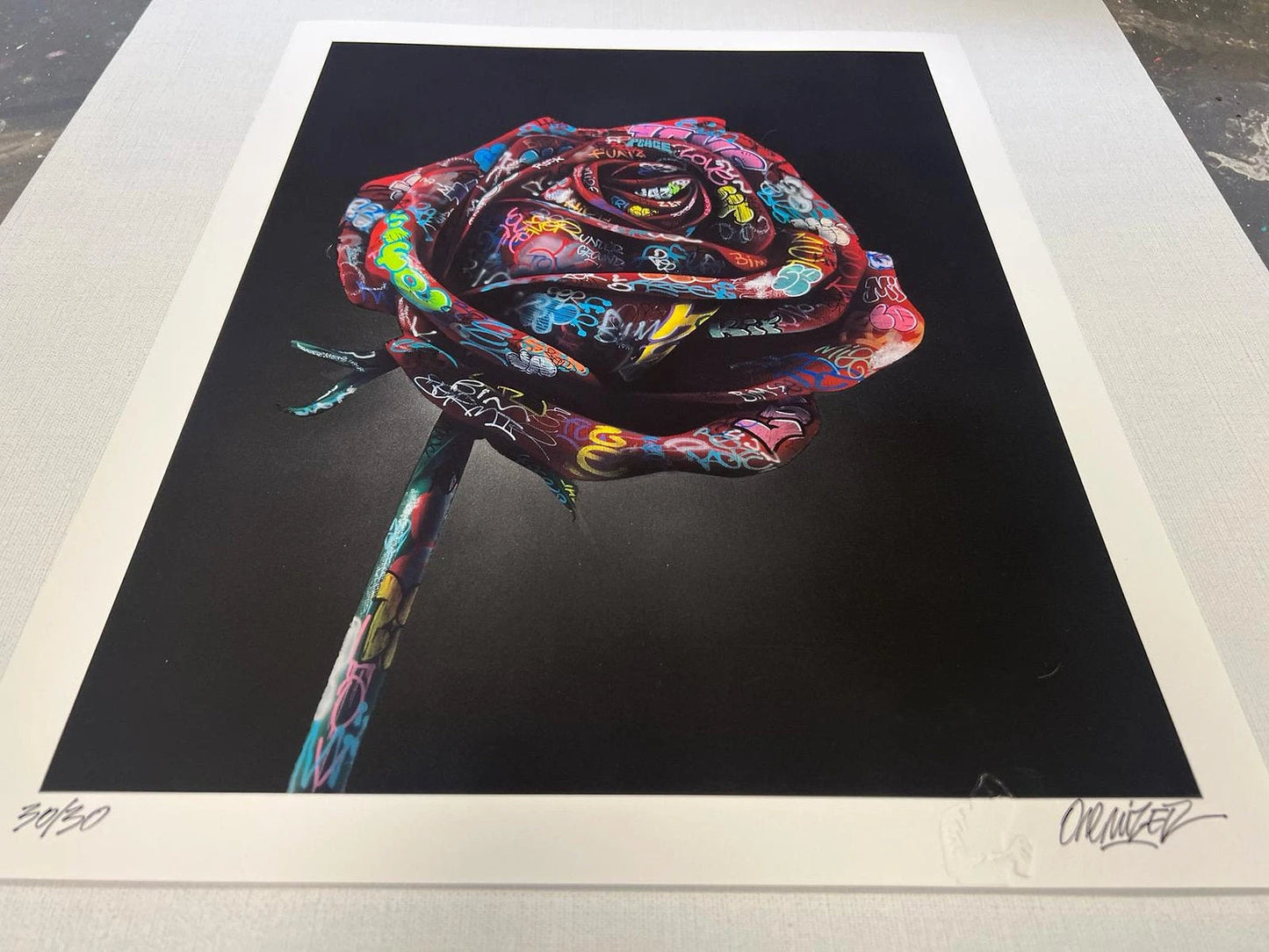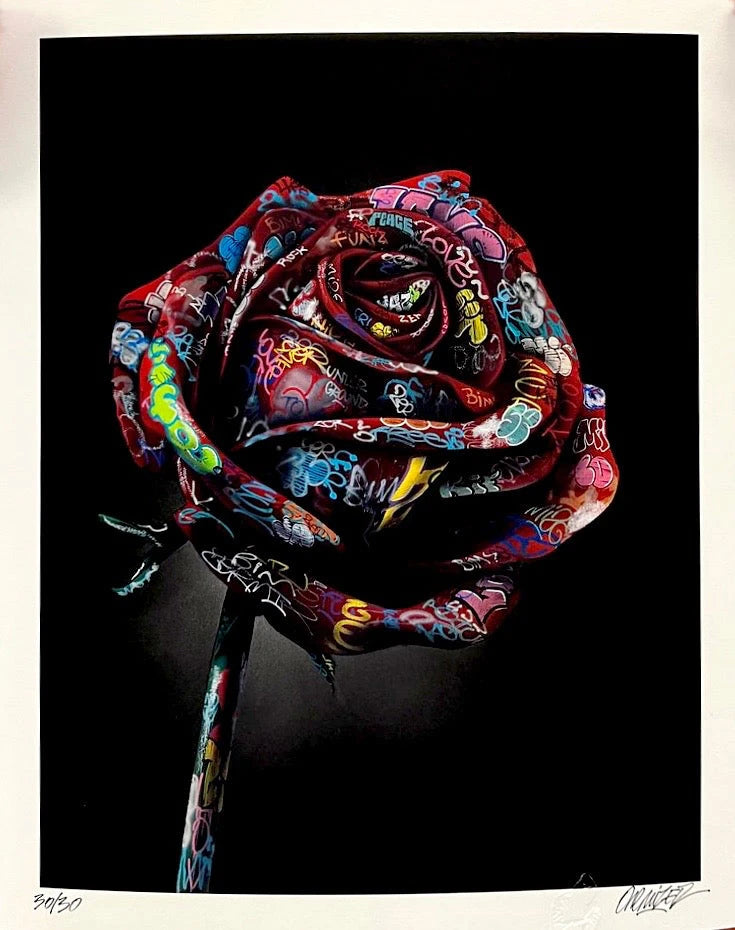 However, what sets this piece apart is the artist's bold integration of a graffiti aesthetic upon the rose's natural form. The petals are adorned with an array of vibrant graffiti tags and colorful motifs, each adding layers of texture and depth. Electric blues, fiery reds, and neon yellows interplay seamlessly across the flower's surface, creating a dynamic explosion of color that captures the viewer's attention instantly.