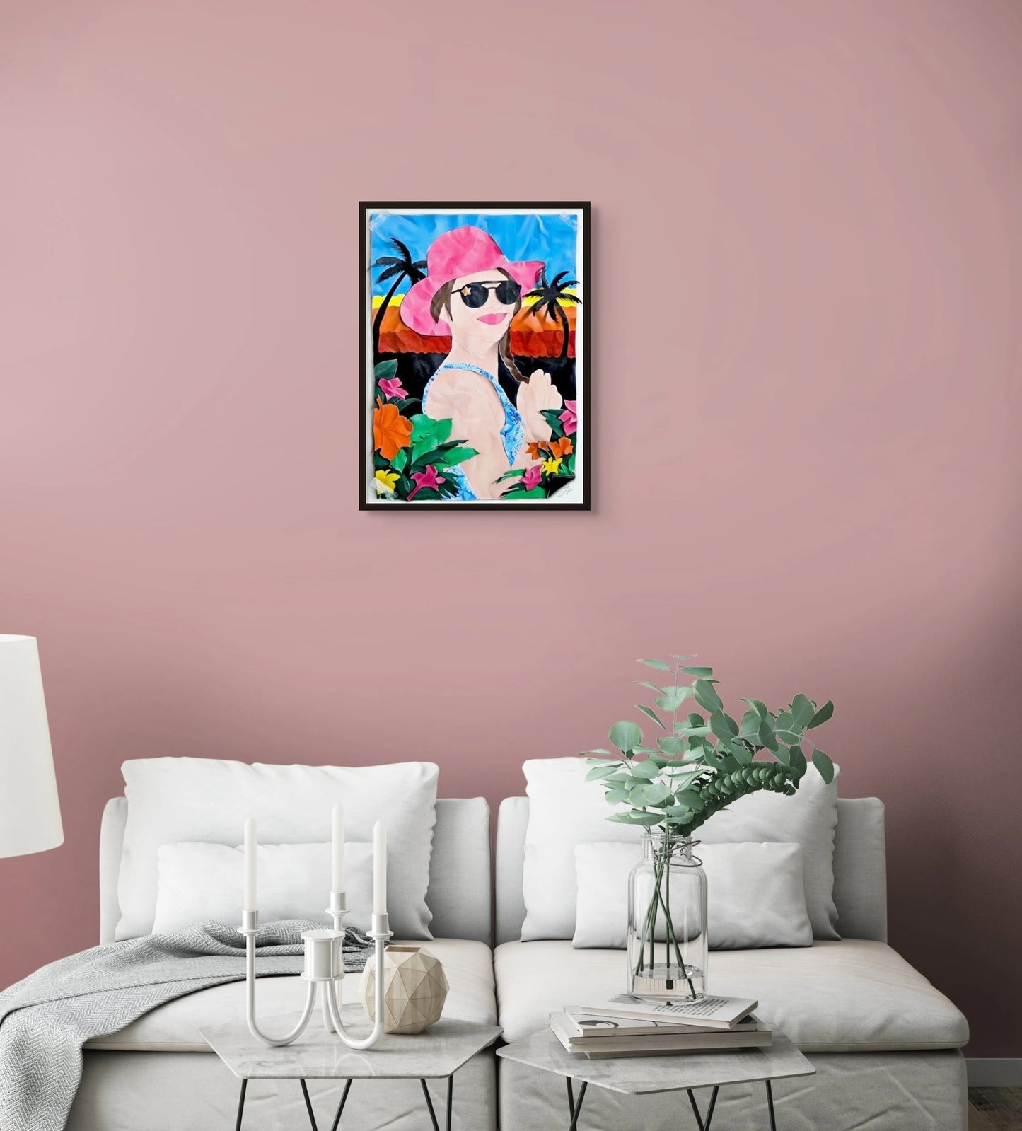 "Sunset Paradise," a stunning airbrushed canvas by the French virtuoso Jessica Renault, invites the viewer into a trompe-l'oeil spectacle that merges the playfulness of a child's craft project with the sophistication of fine art. At 45.5 by 61 centimeters (17.9 x 24 inches), this piece is a window into a world where the joyous abandon of creation is frozen in a moment of sunset tranquility.