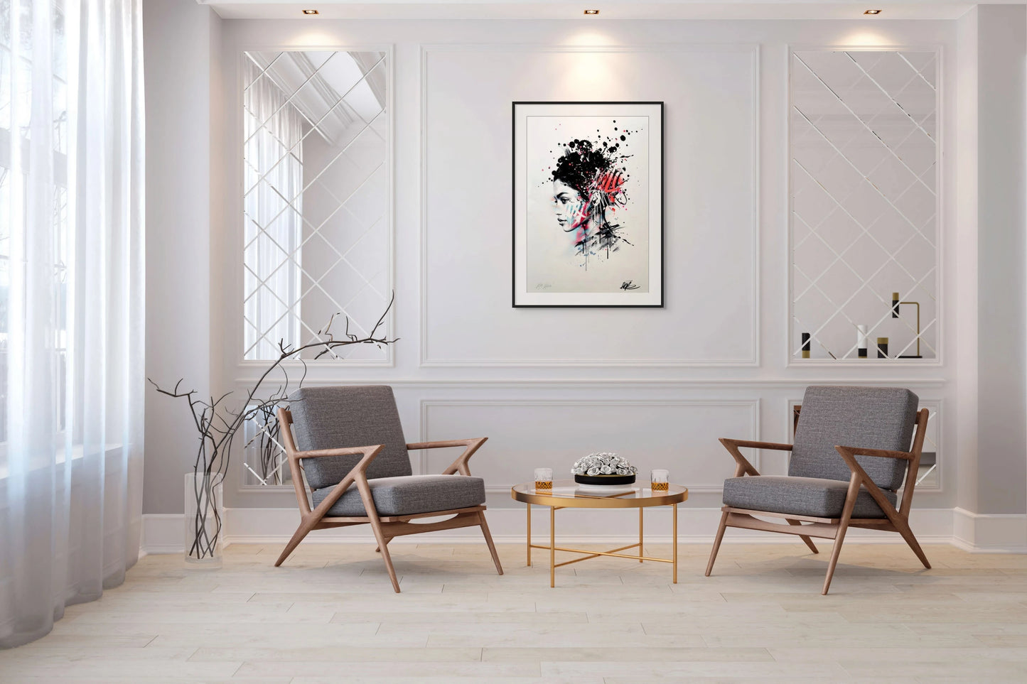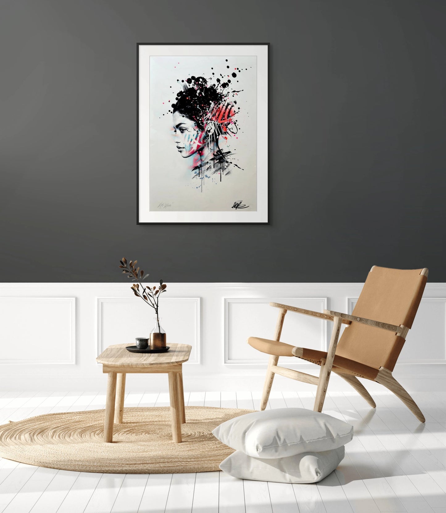 The aerosol acrylic paint employed imbues the piece with texture and depth. Expressive brushstrokes and delicate lines create details and textures that draw the eye and bring the face to life. This amalgamation of techniques lends a contemporary and urban dimension to the piece.