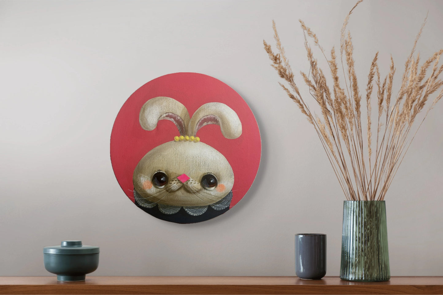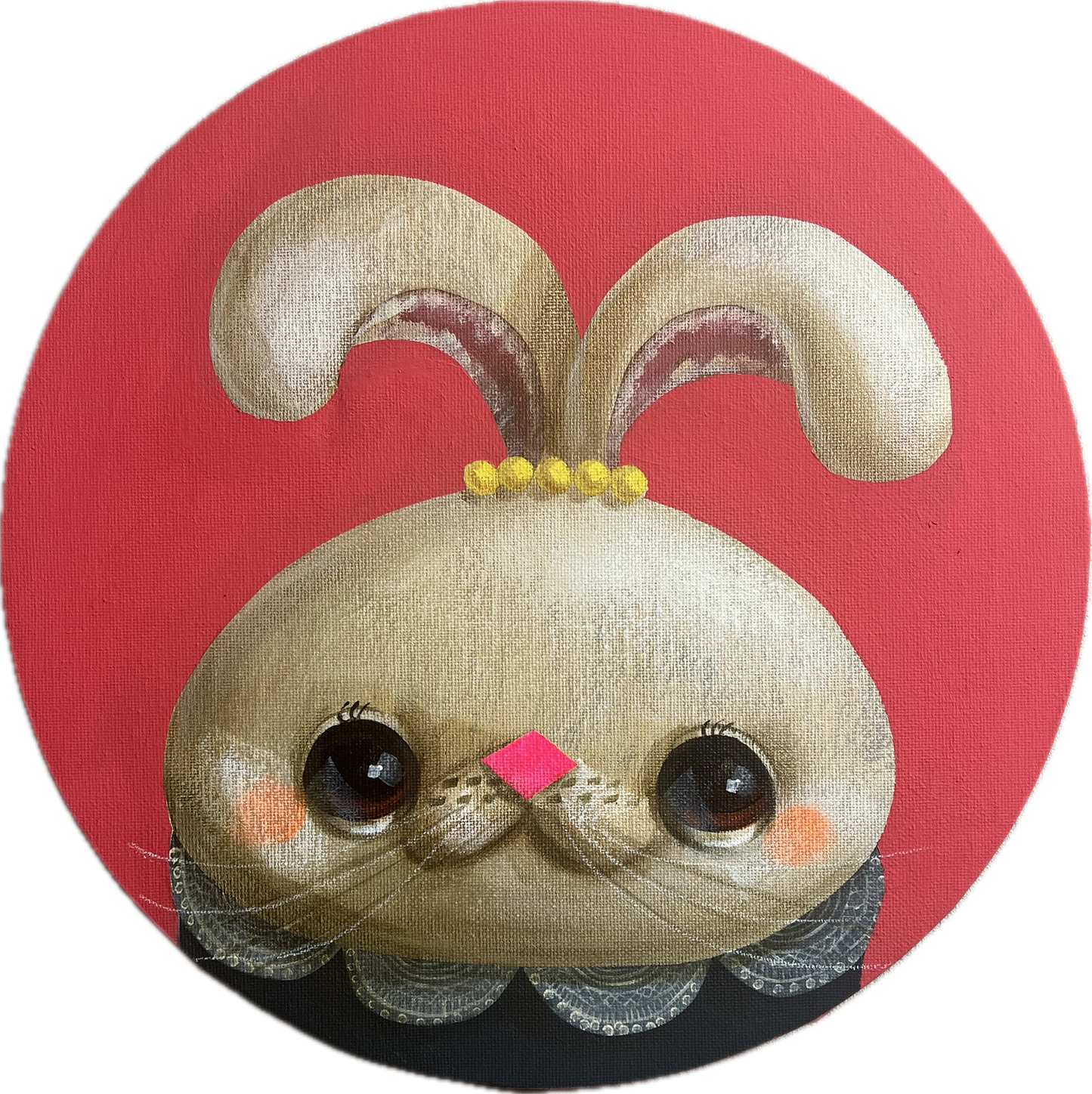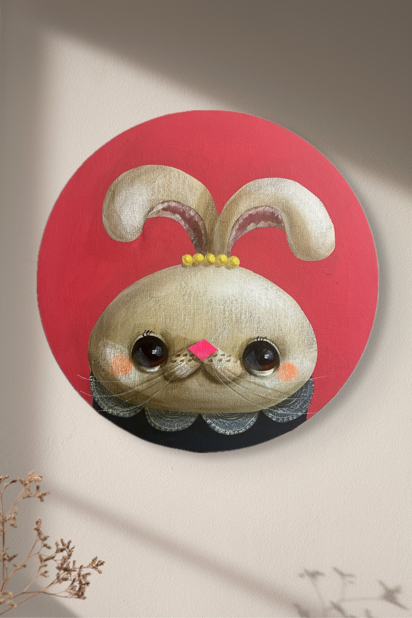 Akio Harada's fanciful artwork "Ear Topknot" depicts a cute bunny with big, curled ears sporting a fun topknot embellished with yellow beads. A touch of weirdness is added by the bunny's pink triangle nose, while its round face, rosy cheeks, and sparkling eyes radiate charm and innocence. The vivid contrast, set against a striking red background, highlights the character's features and grabs the viewer's attention. A subtle touch of sophistication is added by the delicate lace collar, which combines elegance and playfulness. This creative work brilliantly exemplifies Harada's distinctive approach of fusing refined art with endearing charm.
