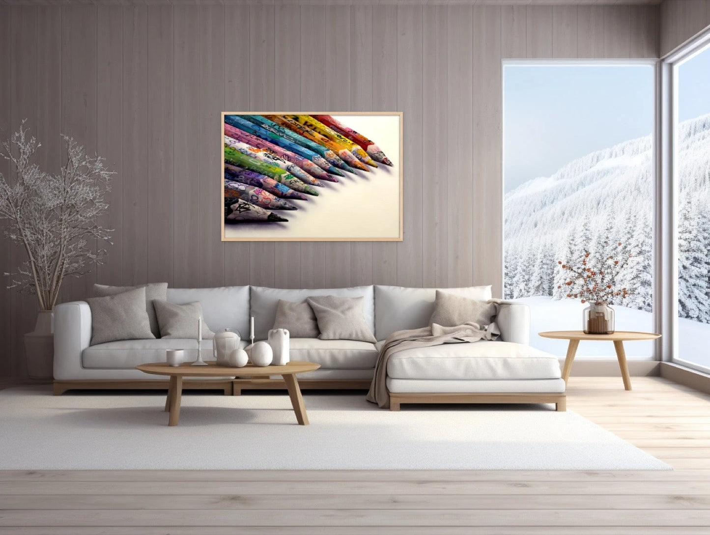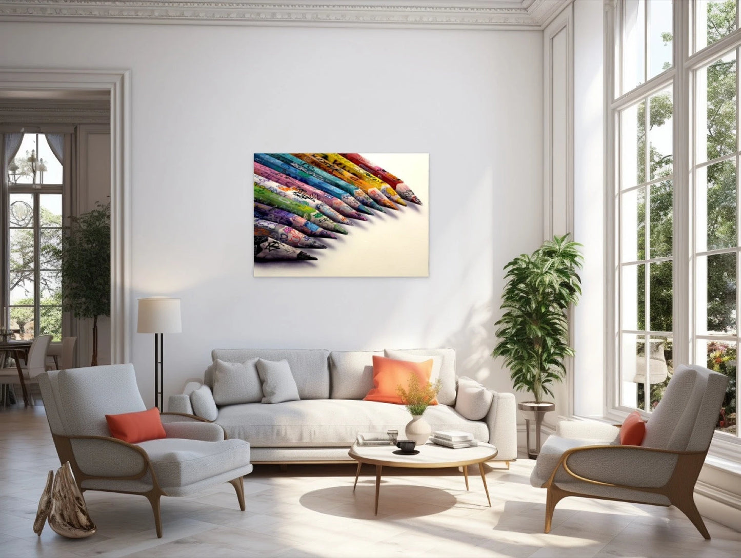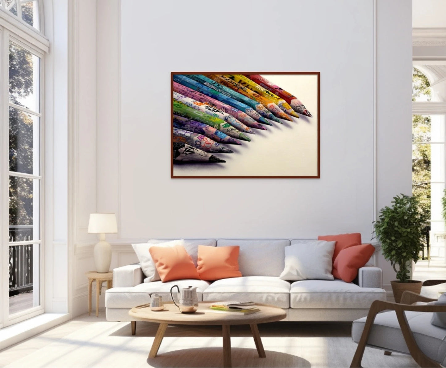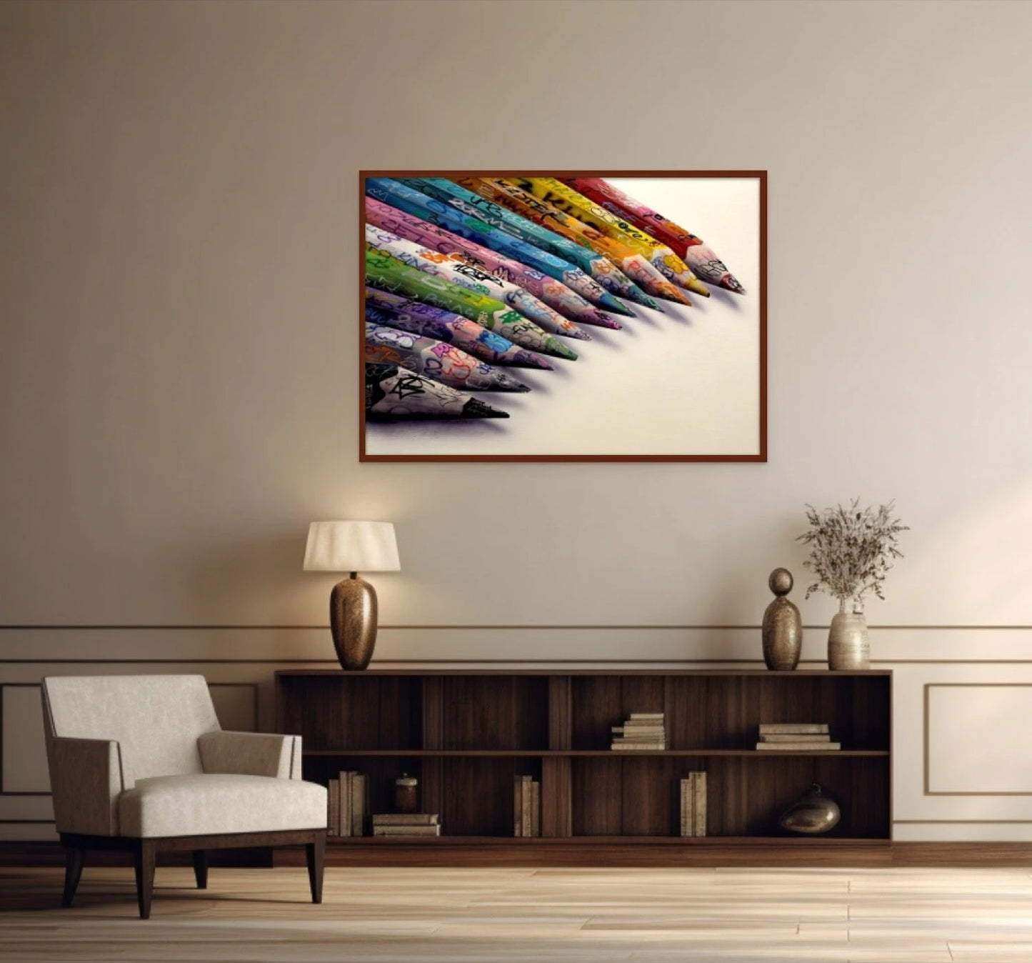 The painting presents an array of pencils lying in unison, their tips pointing towards the viewer. This alignment represents the convergence of ideas, the sharp focus of the artist's mind, and the potential that lies within a simple tool to manifest the grandeur of imagination. The juxtaposition of tagged and untagged areas on the pencils suggests a narrative of emerging identities and stories being written, symbolizing how art is both a universal language and an individual signature.