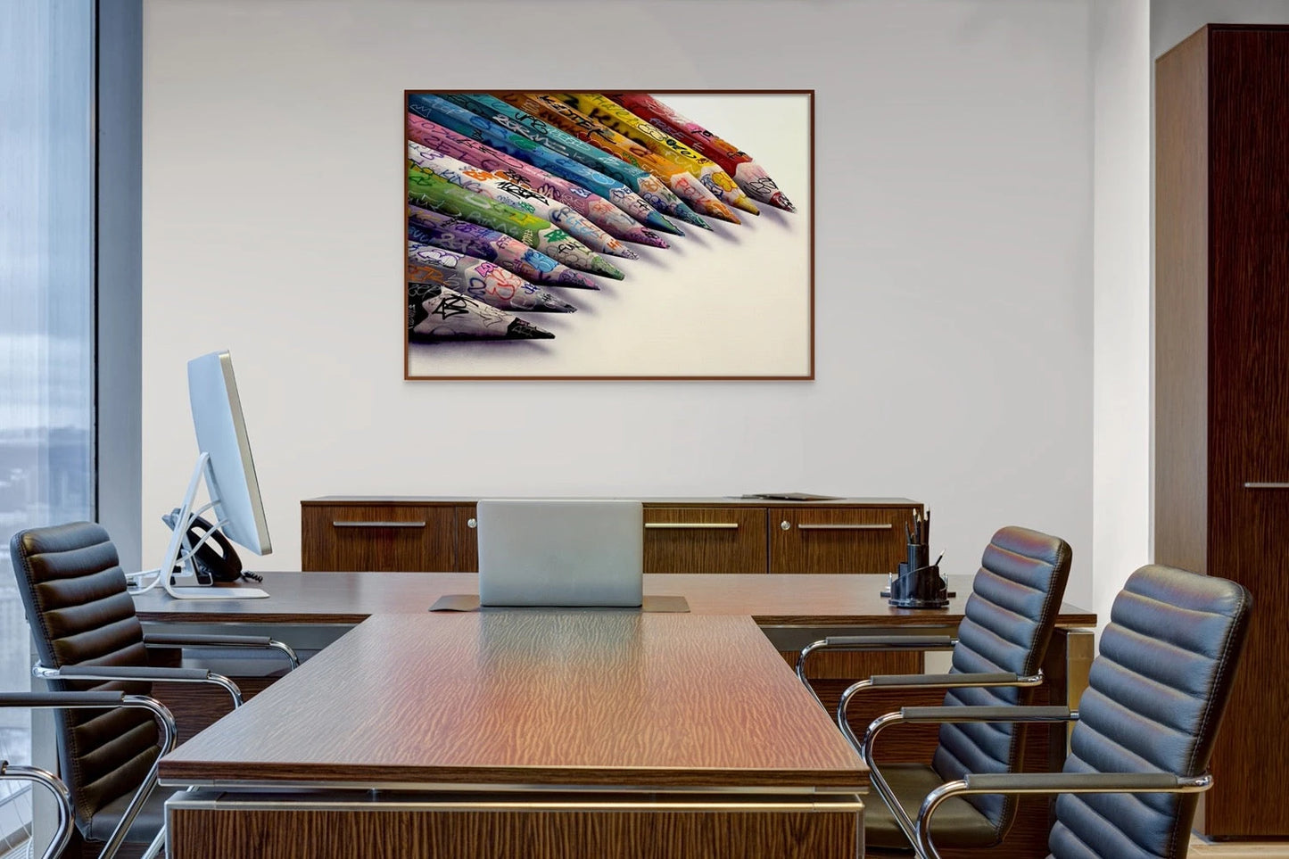 ONEMIZER's "Spectrum of Artistry" is a compelling new work measuring 116x81 cm (approximately 45.7x31.9 inches) that speaks to the heart of creative expression. This canvas is a visual symphony, where the everyday is transformed into the extraordinary through the medium of vibrant, graffiti-adorned pencils. Each pencil is meticulously detailed, not just with color but with the artist's signature tags and symbols, rendered through a masterful blend of acrylic, airbrush, and marker.
