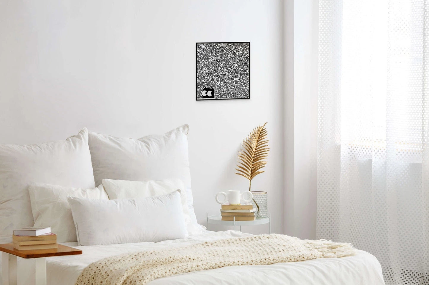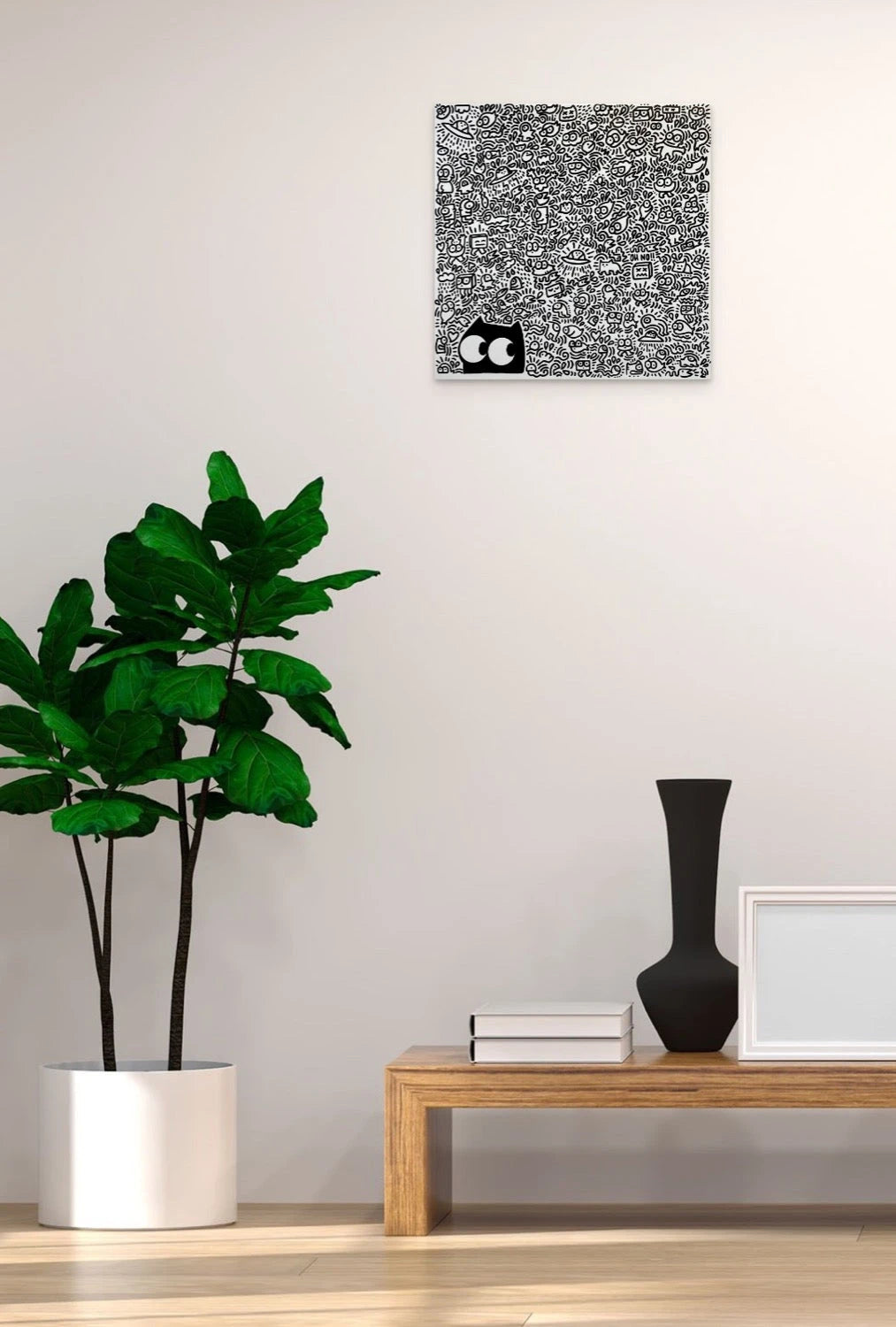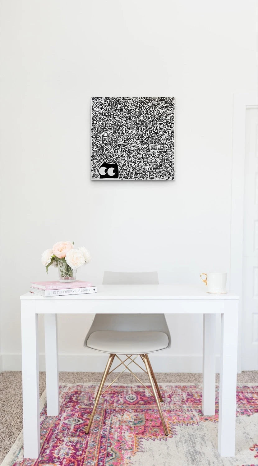 "Calmly" emerges as a mesmerizing 16"x16" inches work by the illustrious BBQUEEN, showcasing the celebrated 'Confused Cat' amid a sea of her quintessential doodles. This intricate interplay of acrylic and marker on canvas invites viewers into a serene yet complex world, where each doodle orbits the iconic feline in harmonious chaos, embodying a tranquil coexistence amidst life's perpetual commotion